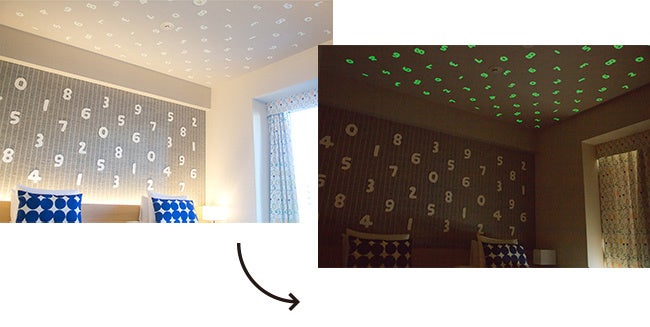 お部屋を暗くすると...SO-SU-U(十数)柄が光り、夜になるのが楽しみになる仕掛けです。