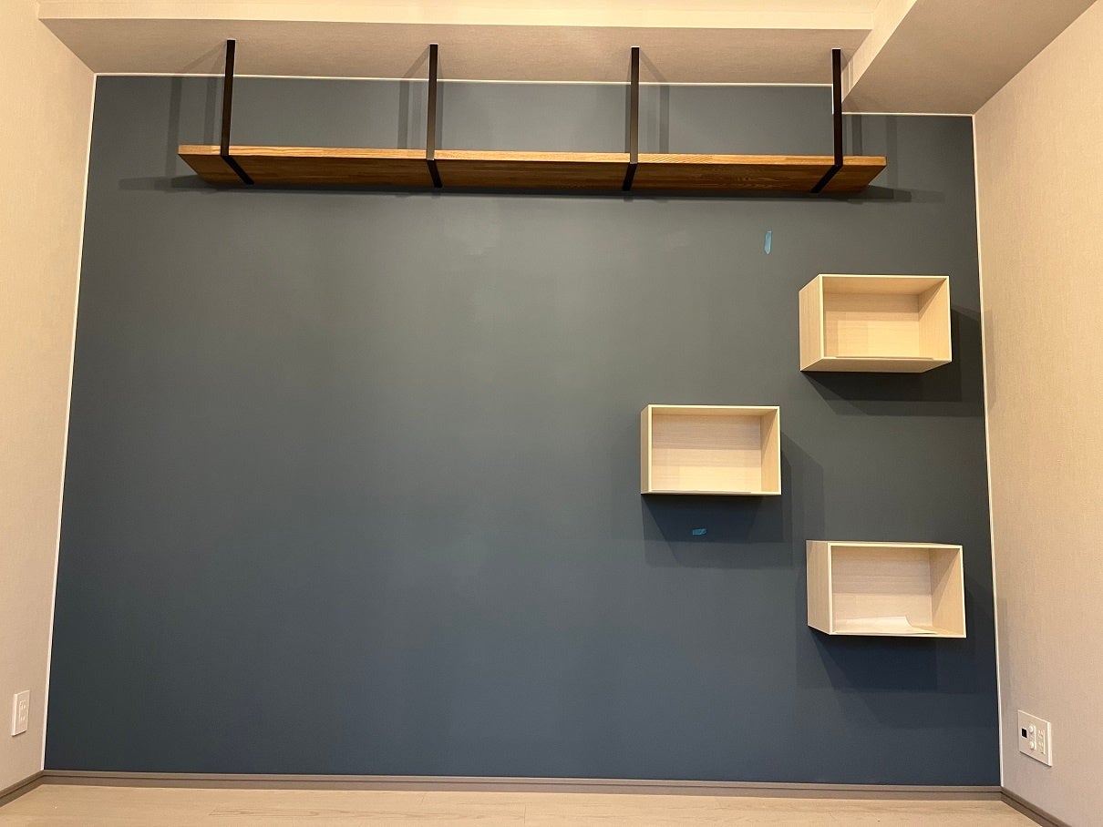 奥のブルーの壁面がマグネット対応壁・左上の箱が強力マグネットbox