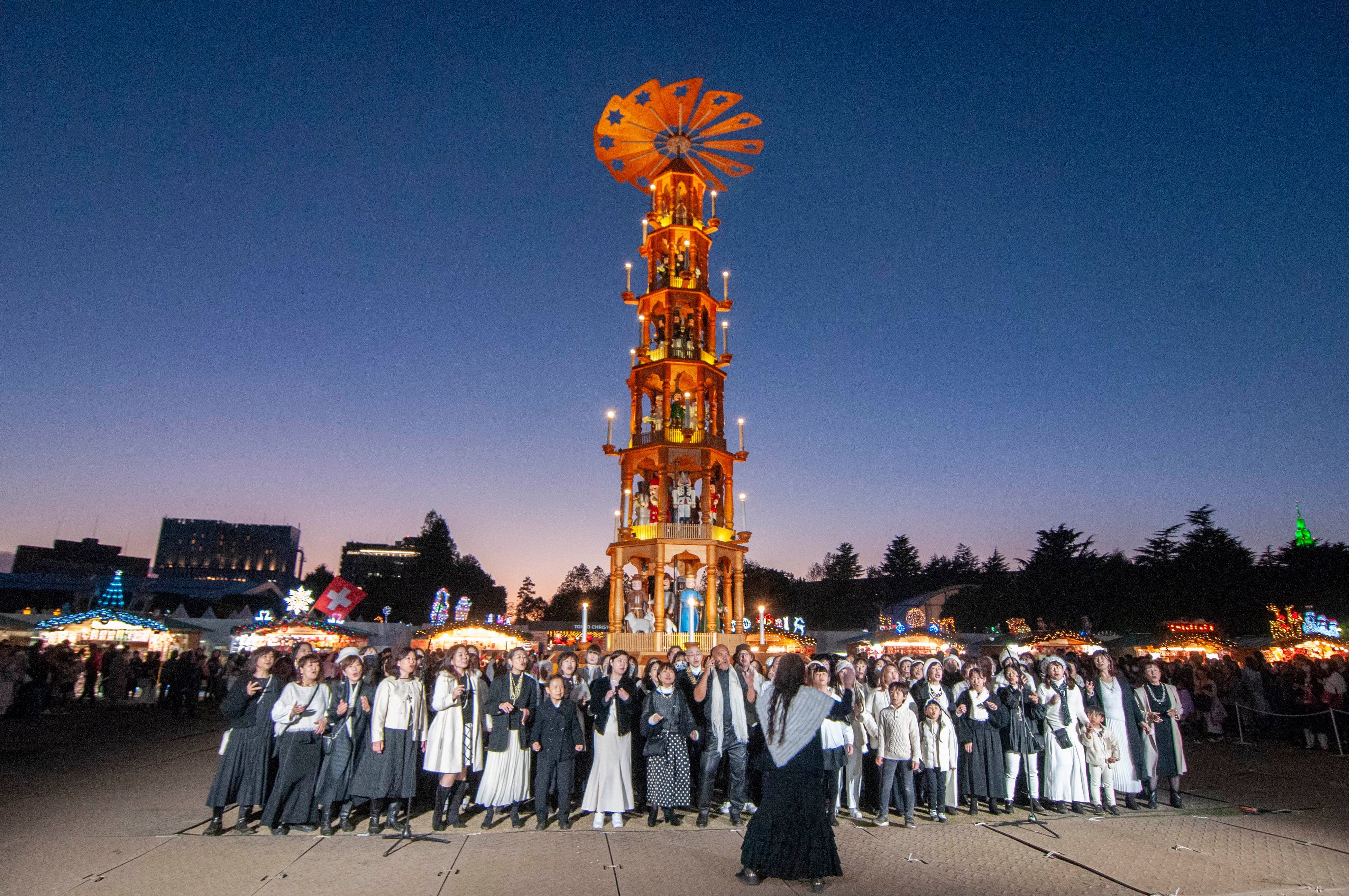 「クリスマスツリー」の原型ともいわれる「クリスマスピラミッド」。私たちのクリスマスマーケットでは、2015年に日比谷公園で初開催した初年度から、世界最古のクリスマスマーケットと言われる「ドイツ・ドレスデン」のクリスマスマーケットと同じ世界最大の高さを誇る14mのクリスマスピラミッドをシンボルとして設置してきました。