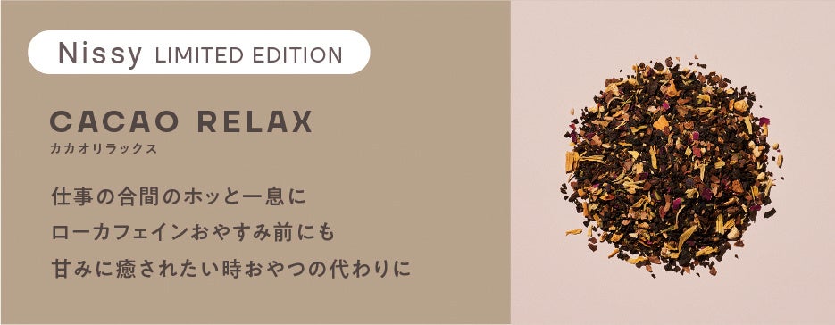 CACAO RELAX(カカオリラックス)、 GREEN CLEANSE(グリーンクレンズ)、ROOIBOS BEAUTY(ルイボスビューティー)。カカオリラックスは、バレンタインデーに合わせたNissy コラボレーションフレーバーです。