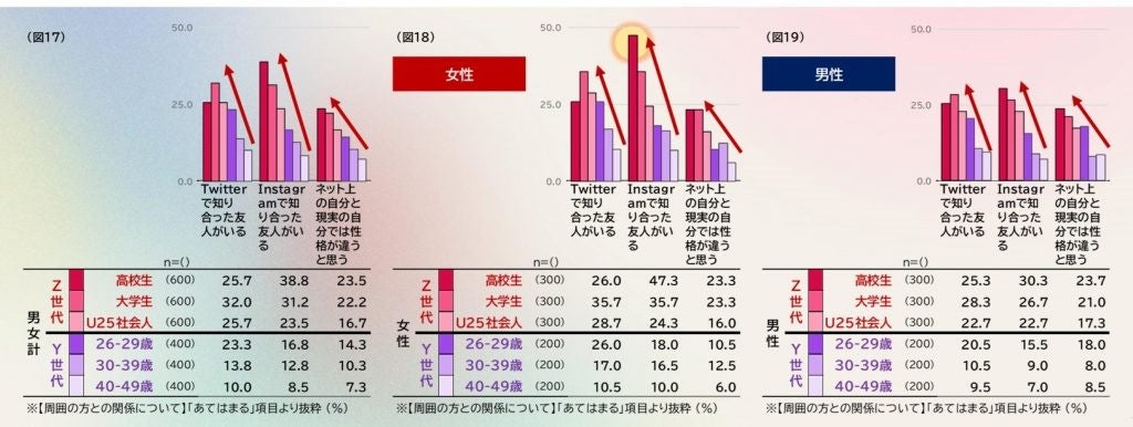 一方で「ネット上の自分と現実の自分では性格が違うと思う」「相手によって自分の態度を変えてしまう」という項目でも、Y世代に対してZ世代は高い選択率でした。Z世代にとっては、「なりたい自分」を演出できる場がSNSやインターネット上なのかもしれません。
