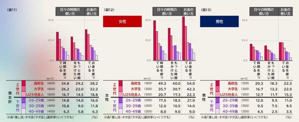 まず、日々の時間の使い方とお金の使い方のデータを改めて確認します。(図11,12,13)結果を見ると、時間をかけてお金も使っている傾向がY世代と比べて際立っており、特に、Z世代女性で顕著となっている様子が窺えます。