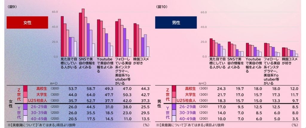 Z世代男女ともに、見た目で目標としている人物がいたり、SNSで美容の情報収集をしている様子が窺えます。背景には、見た目で目標としている人/SNSで情報発信している人の容姿のレベルの高さが、Z世代の美意識向上に大きく寄与しているといった心理があるのかもしれません。