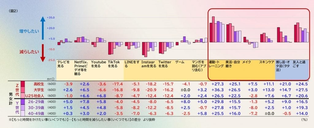 その結果、多く挙げられたYouTube、TikTokなどの動画系とSNS全般は、減らしたい時間に挙げられました。その一方で、自分磨きと、推し活・オタ活、友人との時間はもっと増やしたいという結果となりました。これは彼らが大切またははまっていることではないかと推察されます。