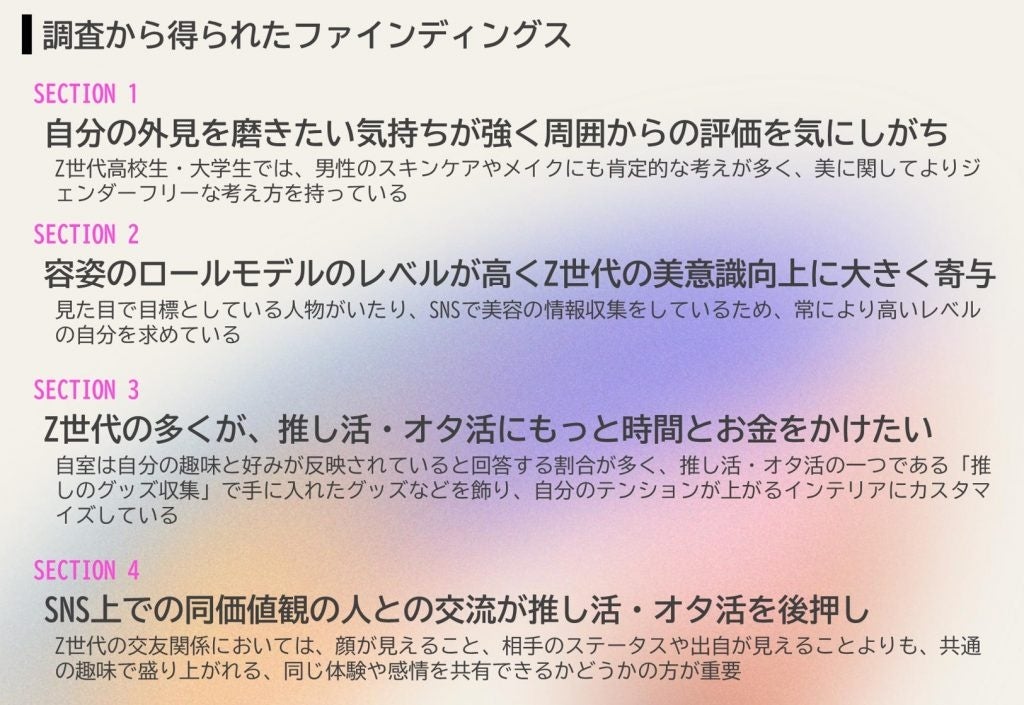 Z世代には、性別にとらわれない美意識の高さ、 「推し活・オタ活」に夢中な様子がみられました。一見器用にも見える柔軟さをもってSNSを活用し、より自分軸を大切にしている様子が垣間見える結果と言えるのではないでしょうか。