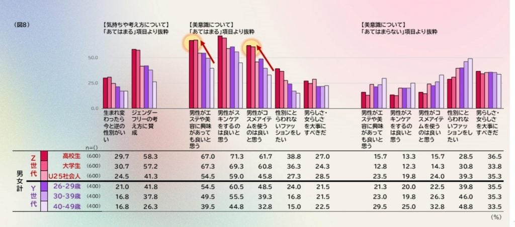 美意識が高かったZ世代高校生・大学生では、「男性がエステや美容に興味があっても良いと思う」「男性がコスメアイテムを使うのはいいと思う」において、半数以上がポジティブに捉えており、美に関してよりジェンダーフリーな考え方を持っていることが明らかになりました。