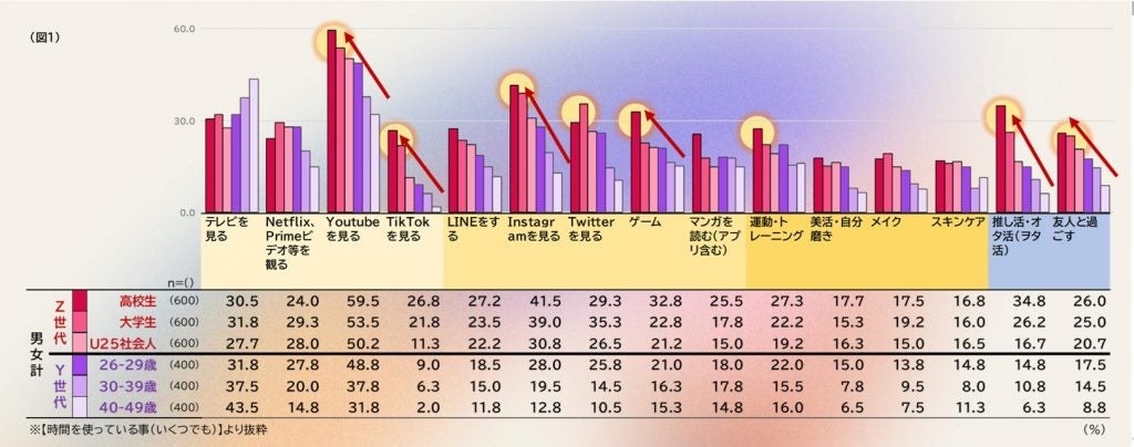 また、運動や美活、スキンケア、メイクアップなど、自分磨きへの時間投資も多いことが分かります。Y世代との差の要因は、男性での実施差が大きいからと推察されます。そして、「推し活・オタ活」について高校生・大学生とY世代の差が顕著に現れました。また、「友人と過ごす」が高いのも特徴でした。