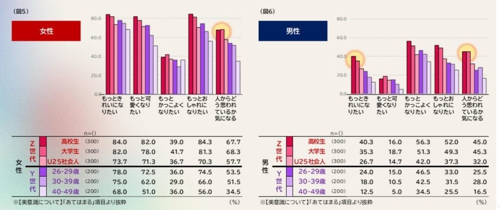 Z世代は、自分の外見を磨きたい気持ちが特に強いようです。これには、周囲からの自分の評価を気にしがちな事も関係していると考えられます。美意識では、ジェンダーフリーな考え方が進んでおり、男性がエステや美容に興味をもつことや、コスメアイテムを使う事などを、よりポジティブにとらえていることがわかりました。(高校生・大学生男子では「きれいになりたい」という意識も見られます)