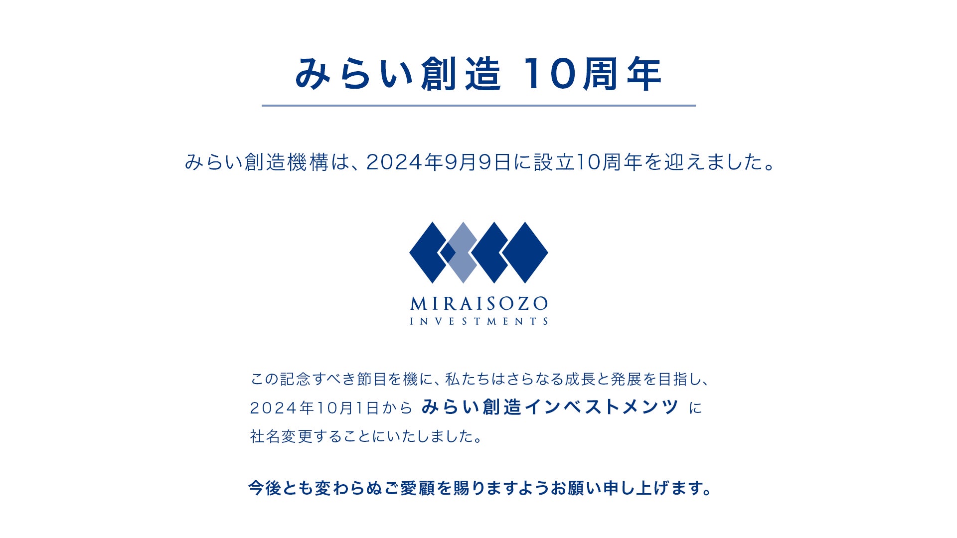 みらい創造機構、創業10周年。次の10年を見据え、「株式会社みらい創造インベストメンツ」へ社名変更