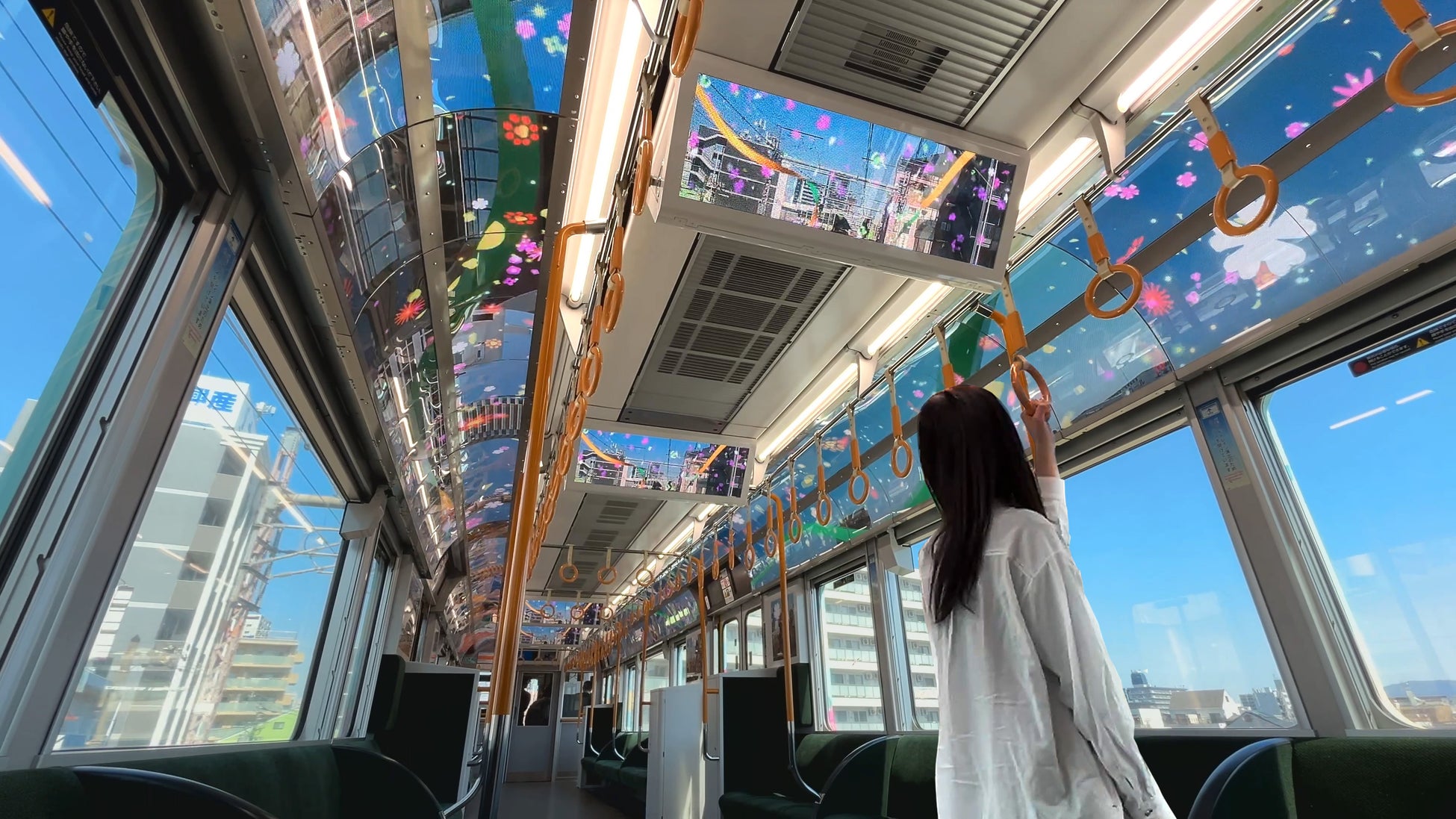 客室全長にわたってLEDパネルを設置し、映像コンテンツを表示し、パレードに包まれるオープンカーのような開放感を演出するため、外の景色をリアルタイムに投影し、AR(AugmentedReality拡張現実)技術を用いて「EXPO2025DesignSystem」のストーリーに沿った演出で万博への期待感を高めております。また、駅区間ごとに大阪をモチーフにしたキャラクターや、紙吹雪・花火・シャボン玉などのエフェクトを表示し、にぎやかに演出しております。