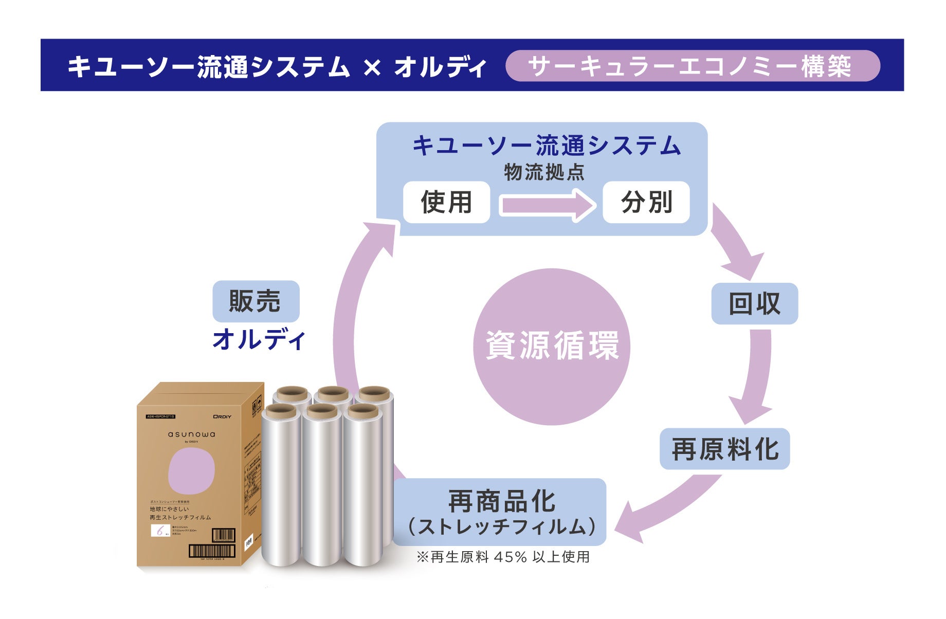 株式会社キユーソー流通システムは、物流拠点で使用したストレッチフィルムの資源を有効活用するため、オルディ株式会社と協力して回収・再資源化し、その原料を用いたフィルム(asunowa再生ストレッチ)を使用することにしました。