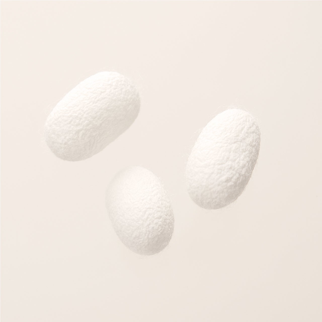 シルクは、蚕(カイコ)の繭から作られる天然繊維。「セリシン」と「フィブロイン」という2つのたんぱく質で構成されていて、お肌の成分に近い約18種のアミノ酸が結合した純粋なタンパク質繊維です。肌の天然保湿因子(NMF)のアミノ酸と似ているため、肌にやさしく、昔から絹の製糸に携わる人々は冷たい水に長時間手をさらしながらも手の肌がきれいと言われてきました。