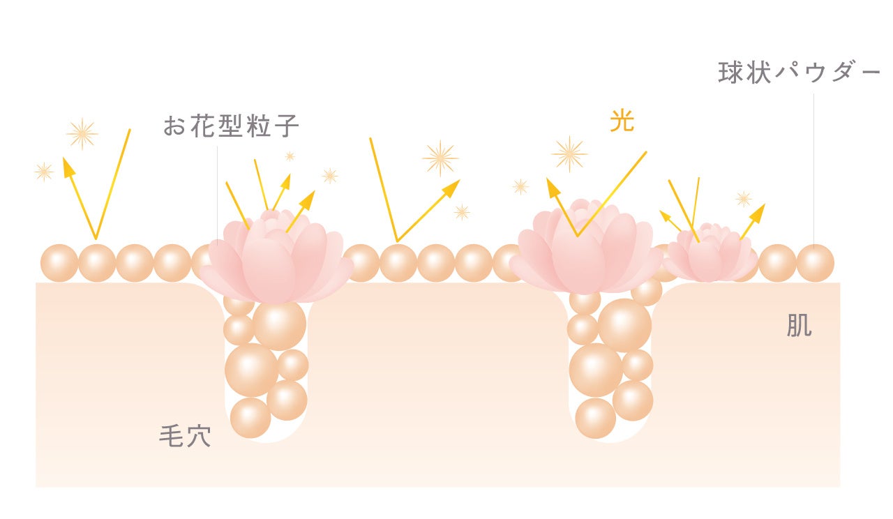 サイズも形もひとつひとつ異なるお花型の粒子と、柔らかい球状パウダーがお肌の凹凸にフィット。光を乱反射させるダブルソフトフォーカス効果で、お肌表面をなめらかにし、シルクヴェールをまとったような上品な仕上がりに。