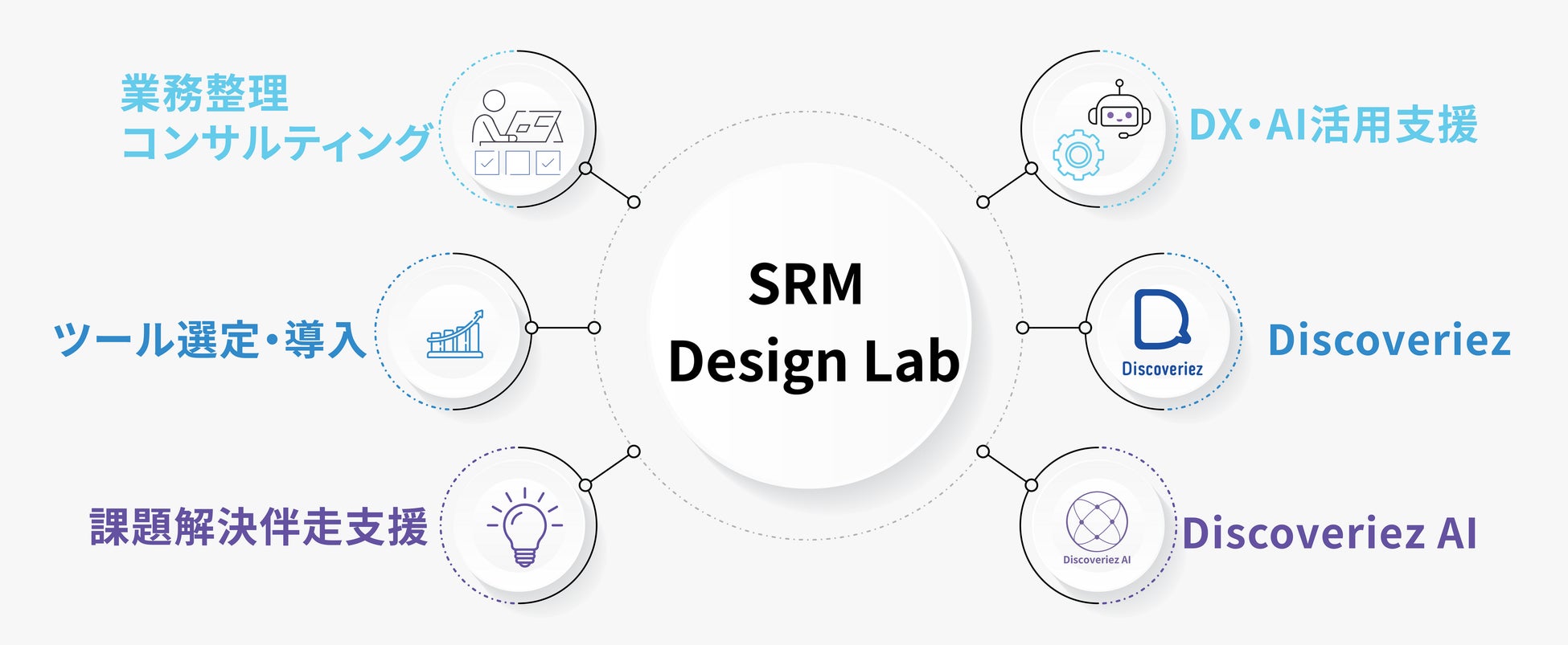 このたび、2024年6月26日の「Discoveriez AI」の発表に伴い、生成AI利活用のプロダクトの提供だけでなく、現業の課題解決プログラムと掛け合わせ、課題解決のスピードをシステム提供/コンサルティングの両面でよりスピードUPをしていくため、「SRM Design Lab」のラインナップに生成AI活用支援、「Discoveriez AI」、生成AIツール選定・導入等を追加することとなりました。