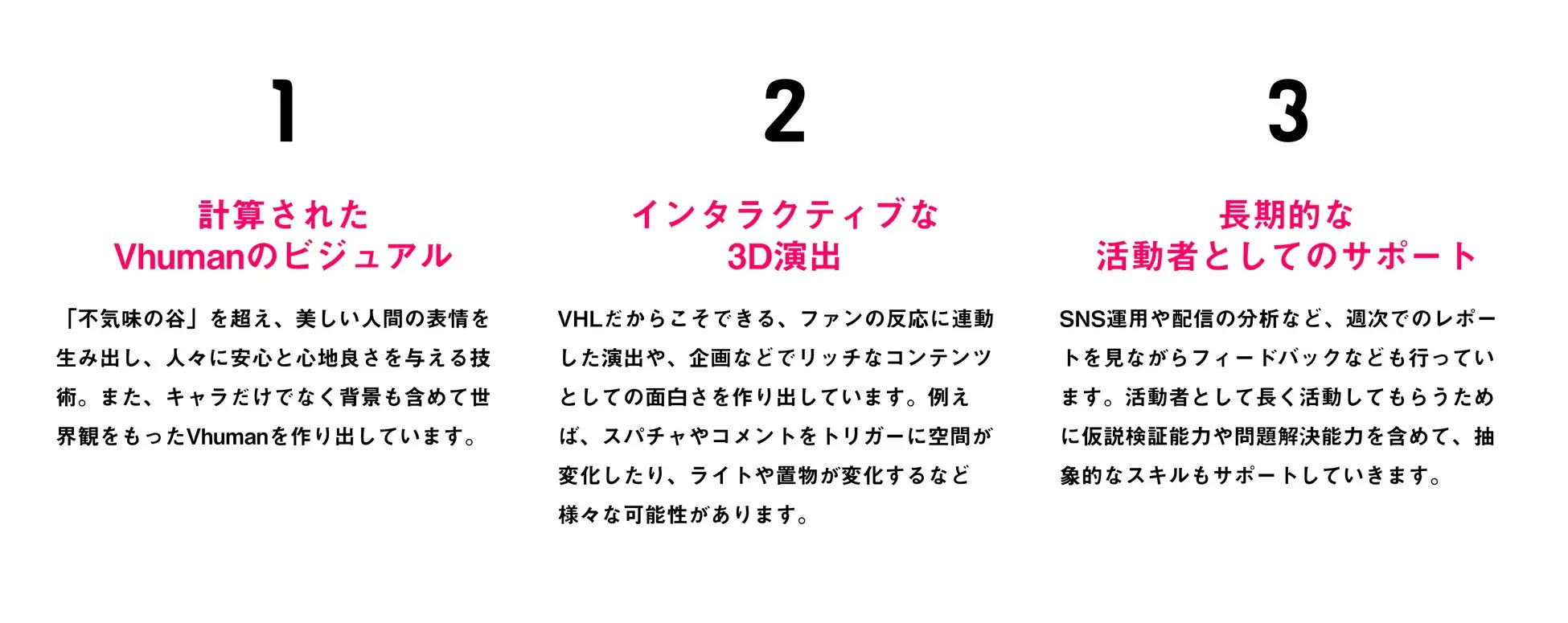 また、今後の展開として配信活動だけに留まらず、アーティスト活動やタレント活動なども見据えており、VHumanのルックだからこそできる幅広い活動、さらには、音声や動画などにAIを活用しながら、より一層エンタテイメントの価値を高めていきます。