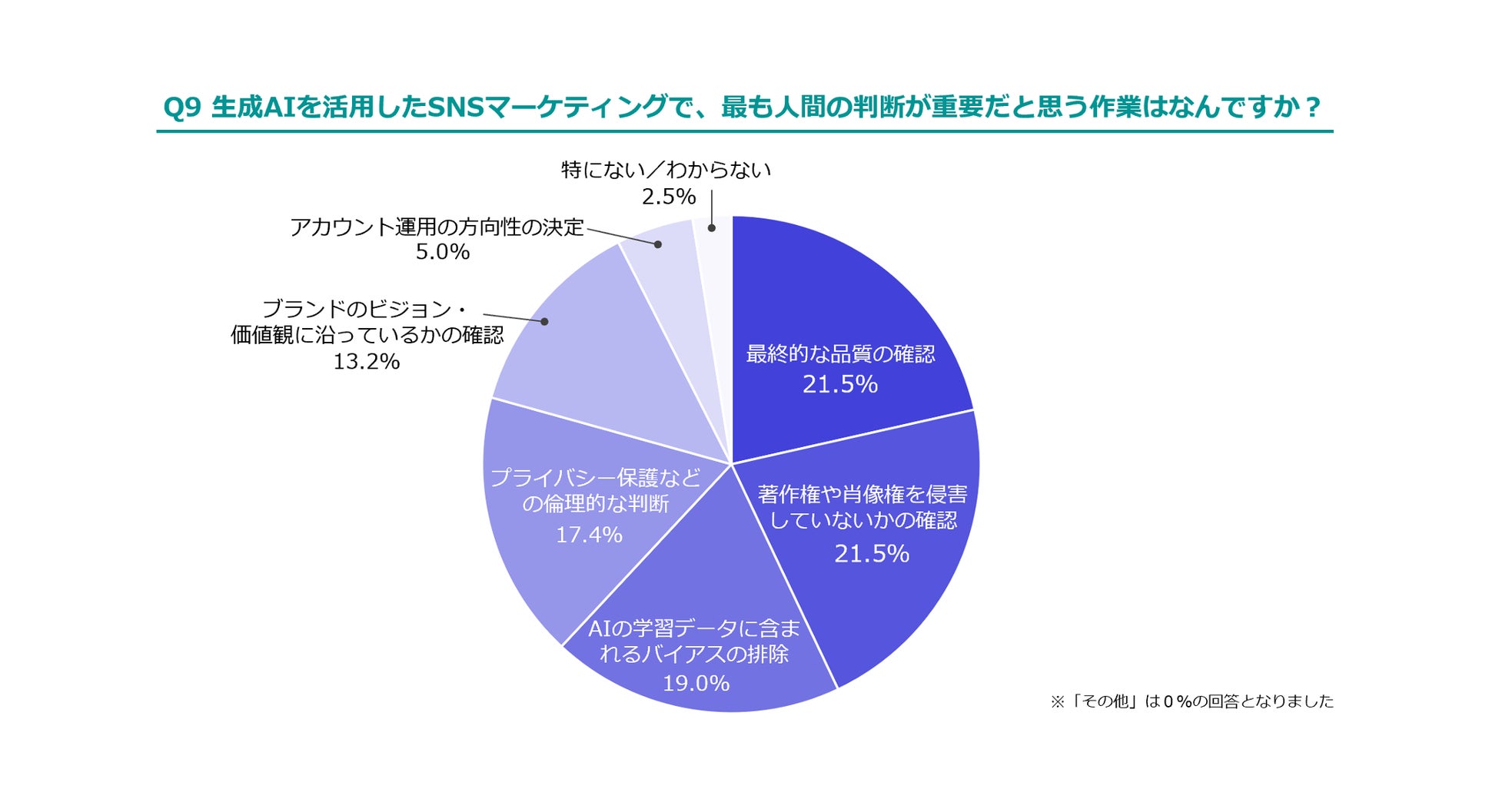 生成AIの活用において最も人間の判断が重要だと思う作業として、「最終的な品質の確認」と「著作権や肖像権の侵害の確認」が全体の21.5%を占める結果となりました。