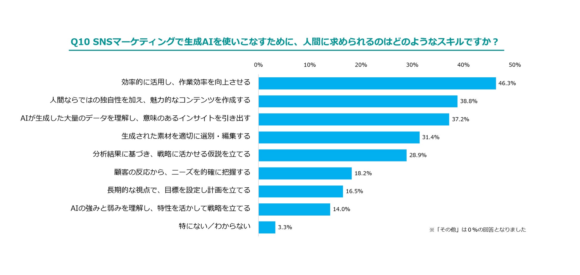 また生成AIの利用に関して、著作権などの権利の侵害や出力結果に対する懸念が伺えました。不特定多数に発信するSNS運用で活用するからこそ、権利侵害には十分に注意する必要があるのでしょう。生成AIのSNSマーケティング活用が広まってきた中で、生成AIを用いながらいかにして周りとの差を作るかという点でも、人間ならではの独自性を加えるスキルというのは重要だと考えられます。