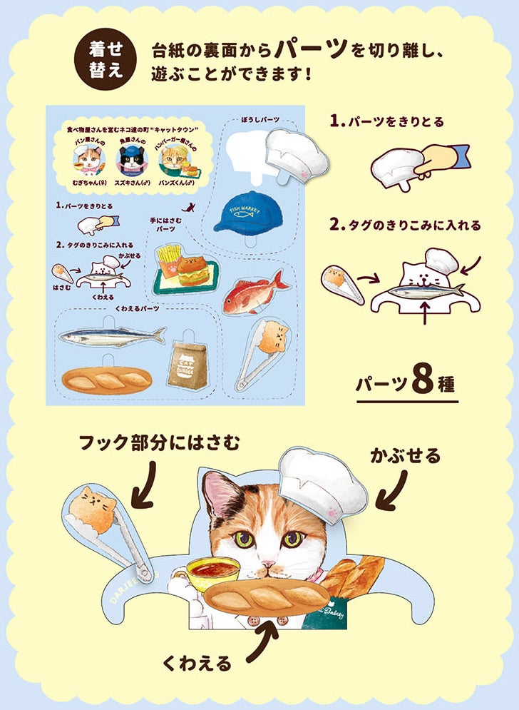 裏面の台紙を切り抜くと、それぞれのお店で販売している商品や制服などが着せ替えパーツとして楽しめます。あなたのセンスで自由に付け替えて楽しんでみてください!