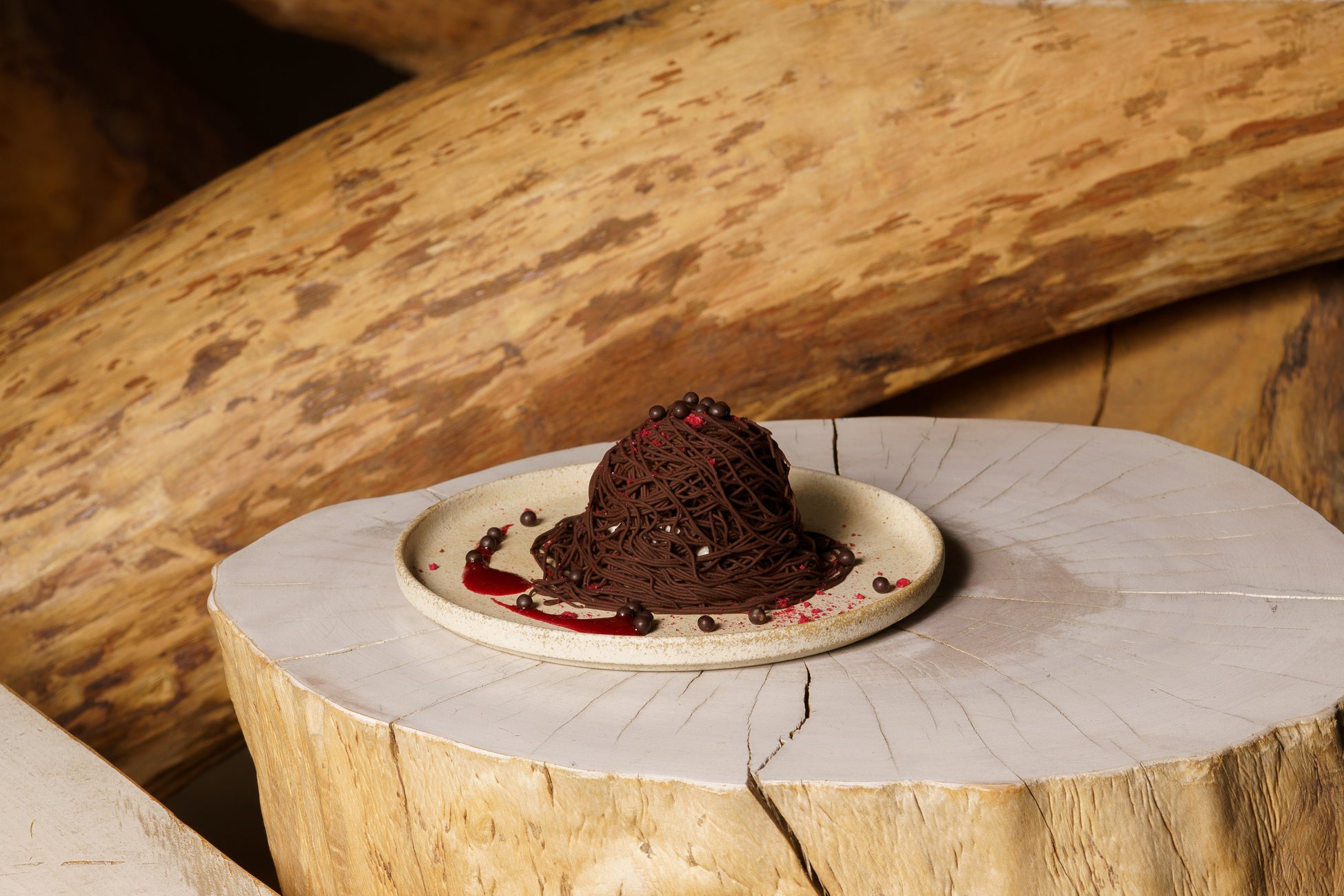 ラム酒香るチョコレートスポンジにビターチョコチョコレートアイス、ラズベリーソース、ホイップ、さらにその上に1㎜で絞ったチョコレートモンブランクリームをのせた大人味の限定モンブラン。※ラム酒はアルコール分をとばしております。
