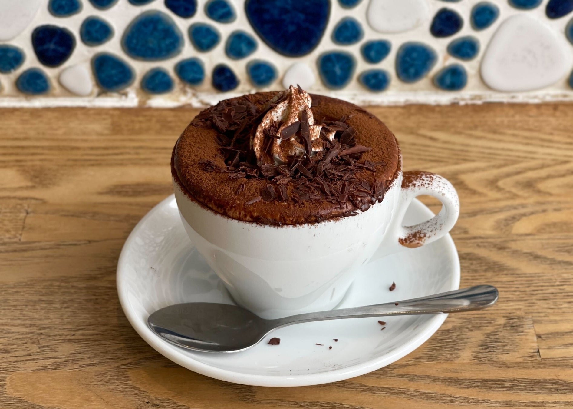 濃厚ホットチョコレートに、生クリーム、ココアパウダー、ダークチョコレートのスライスをたっぷりとのせました。飲み進めていくと深みが増し最後までチョコレートをお楽しみいただけます。