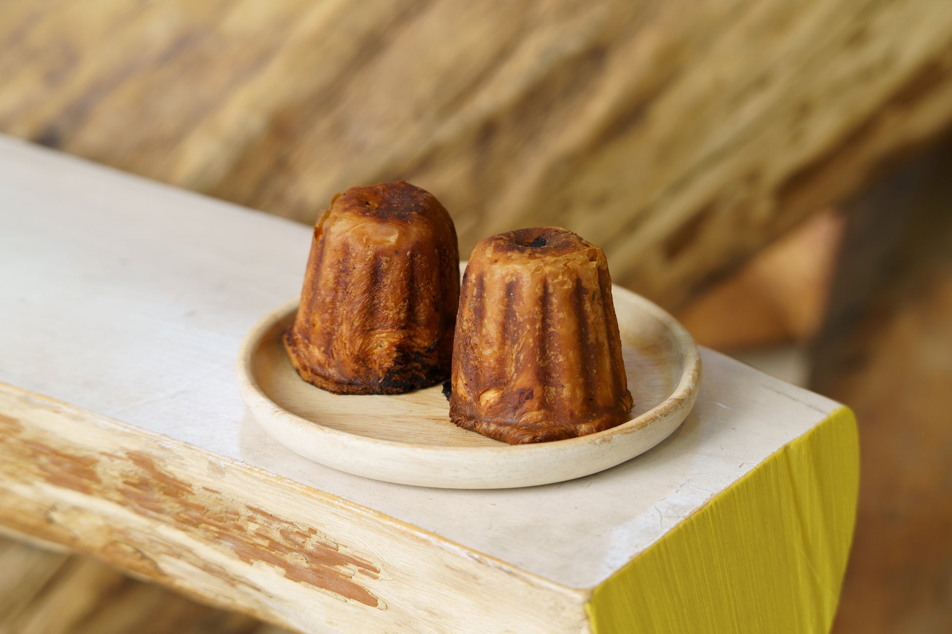 クロワッサン生地をカヌレ型に入れパリッと焼き上げました。中には自家製のオレンジショコラガナッシュとアーモンドホールが。