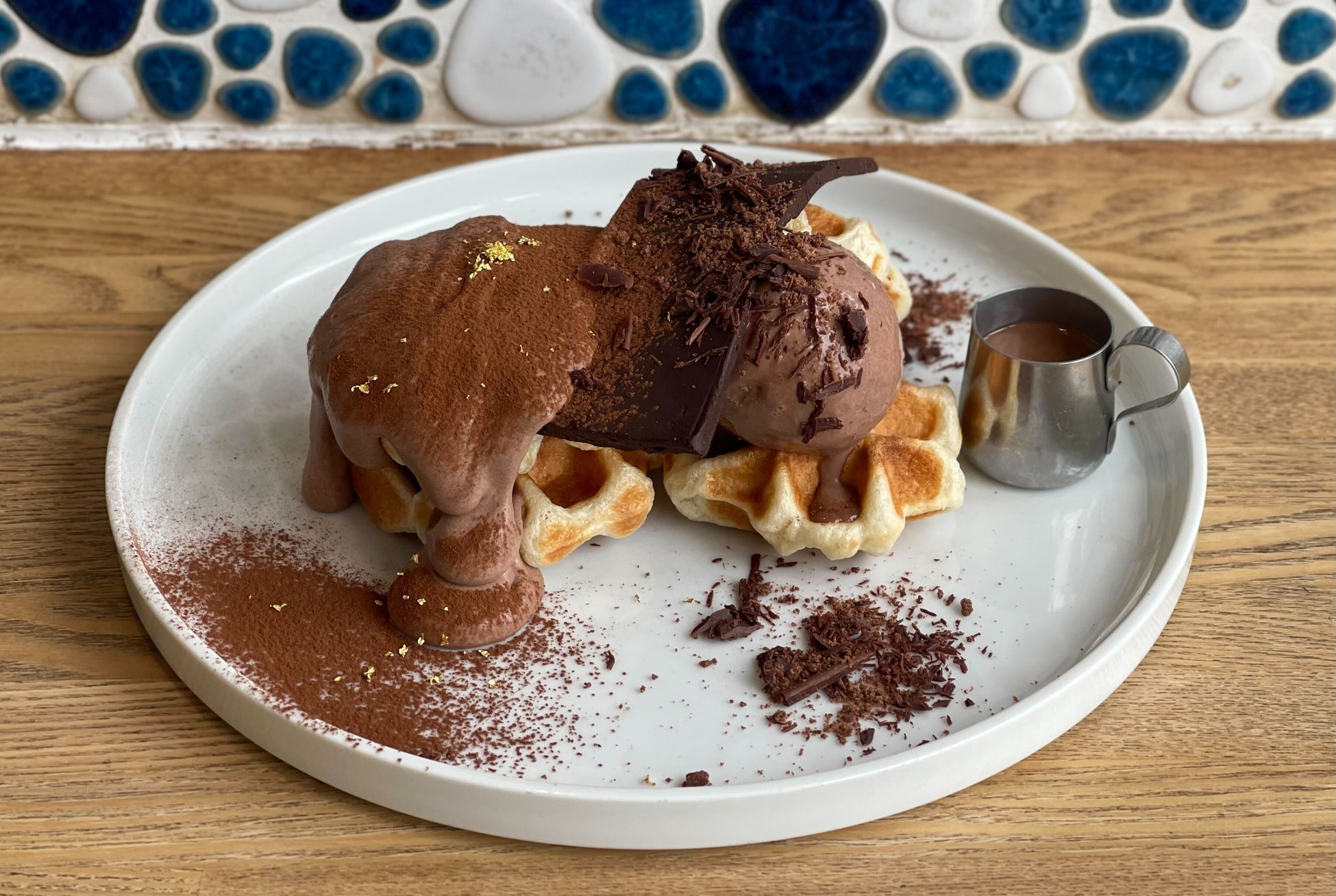 一番人気の食パン「ムー」の生地をワッフル型で焼いたムッフルに、自家製生チョコレートスライス、チョコレートクリーム、ココアクッキー、ショコラアイスをたっぷりと盛り付け、別添えでビターなチョコレートソース付き。温かいチョコレートを焼きたてのムッフルやアイスの上にかけるとより濃厚で贅沢な味わいになります。