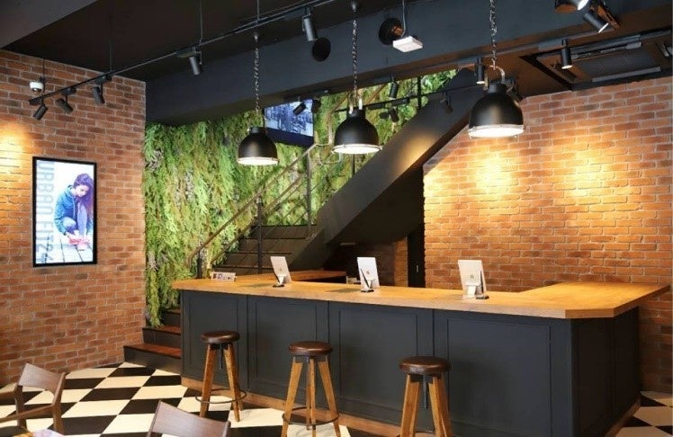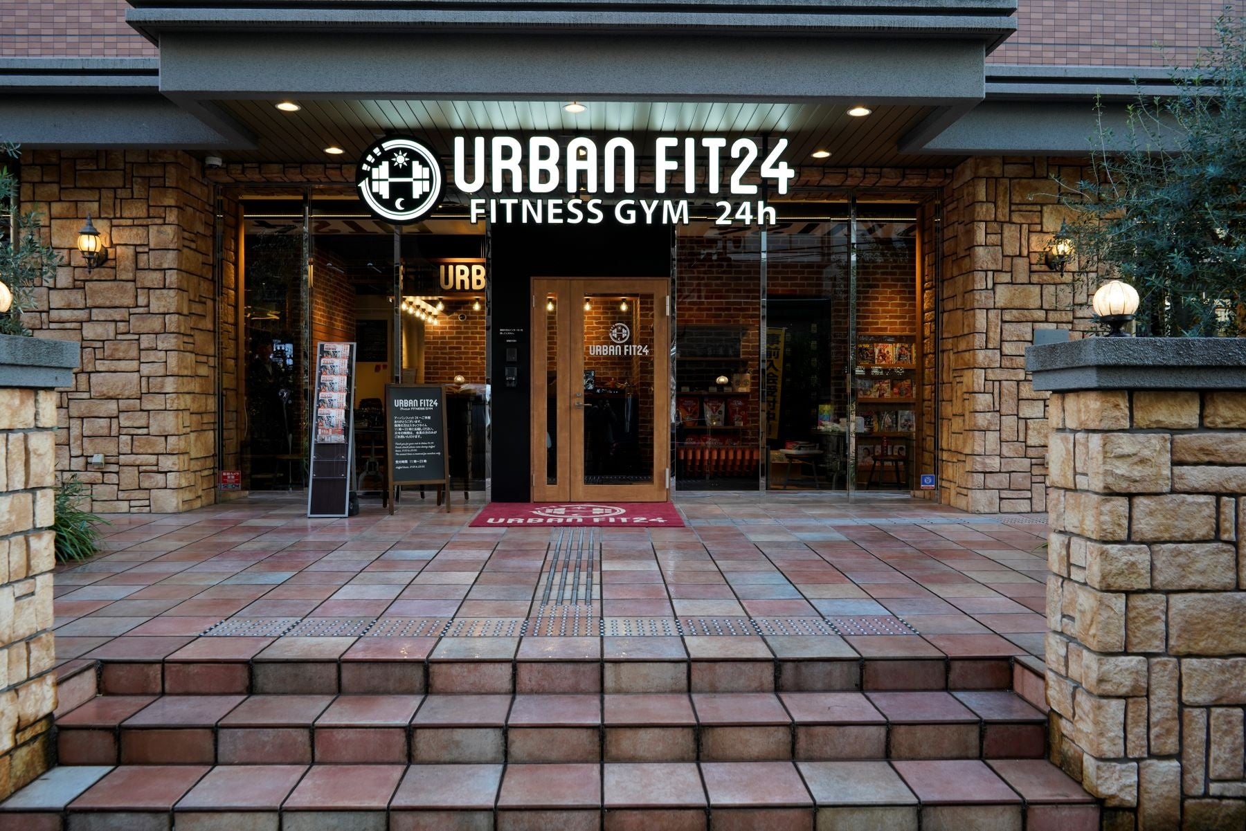 「URBAN FIT24」のブランドデザインコンセプトとして全店統一に展開している、レンガ調のブルックリンスタイルと受付カウンターや自然を感じられるグリーンなどから構成されている内装デザインです。
