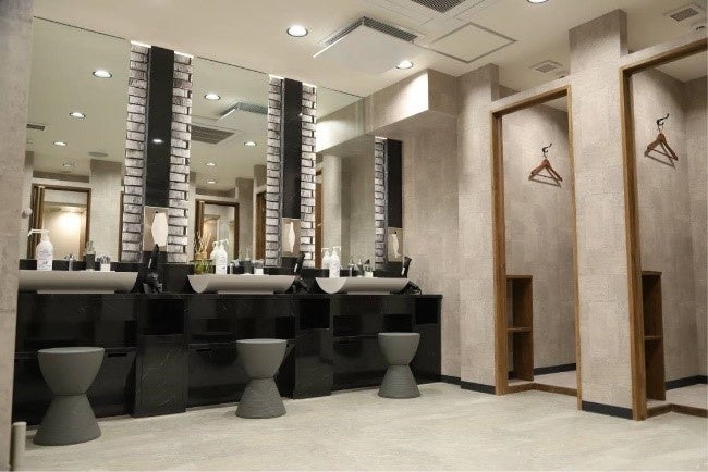 「URBAN FIT24」は、女性人気の高いフィットネスジムです。パウダールームは店舗内と同じくレンガ調のブルックリンスタイルの色調を少し変え、落ち着く空間を演出しております。レンガと鏡と水回りを融合させたおしゃれな内装デザインです。
