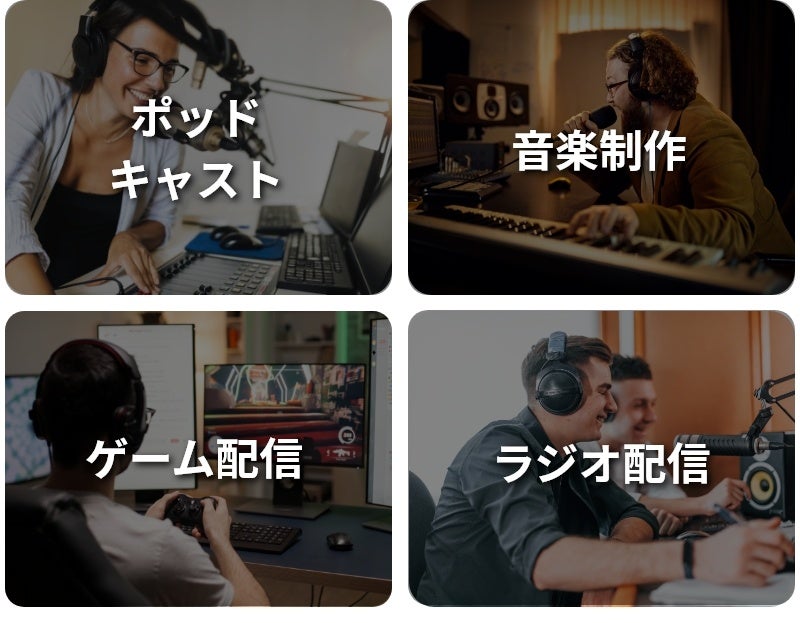 コンテンツ制作からポッドキャスティング、ライブストリーミング、音楽制作、オーディオレコーディングまで、広範な用途で使用可能です。サウンドミキサー、サウンドカード、ボイスチェンジャー、サウンドエフェクトボードの全ての機能が一体化しています。ポッドキャスト、ライブストリーミング、音楽制作、オーディオレコーディング、オンラインゲームなど、さまざまなシーンで活用可能なツールとして提供されています。