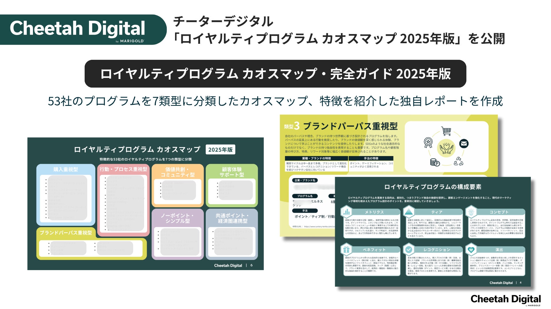 マーケティングテクノロジーを提供するチーターデジタル株式会社(本社:東京都港区、代表取締役社長:瀧本(浅坂)絵美、以下: チーターデジタル)は、「ロイヤルティプログラム カオスマップ 2025年版」および各社の事例を紹介するeBook「ロイヤルティプログラム完全ガイド 2025年版」を公開しました。