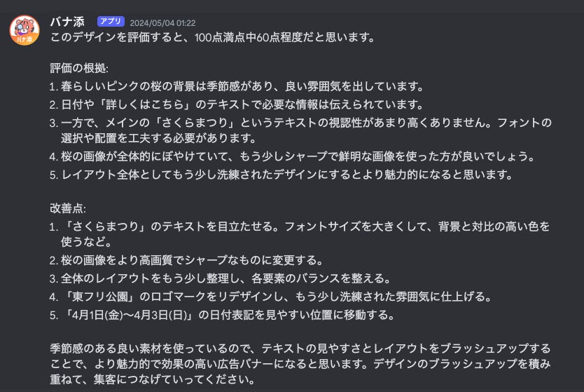 バナ添は、米Anthropic社が提供する大規模言語モデル(LLM)「Claude3」を採用しています。アップロードされたバナーに対し、素材選定、フォントの使い方、テキストの大きさ、要素の配置バランスなど、デザインの構成要素を総合的に評価し、改善につながるアドバイスを提供します。