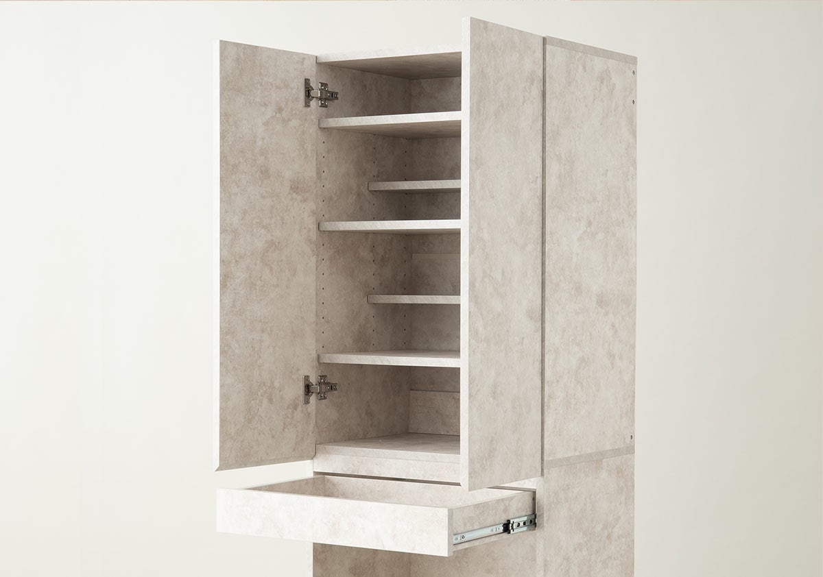 上段は食器や食品ストックに中段の引き出しには小物収納を。使いやすさにこだわって設計しました。