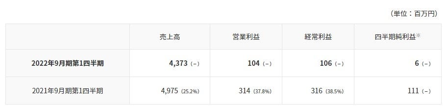 2022年9月期 第1四半期連結業績は、売上高4,373百万円、営業利益104百万円、経常利益106百万円、四半期純利益6百万円となりました。