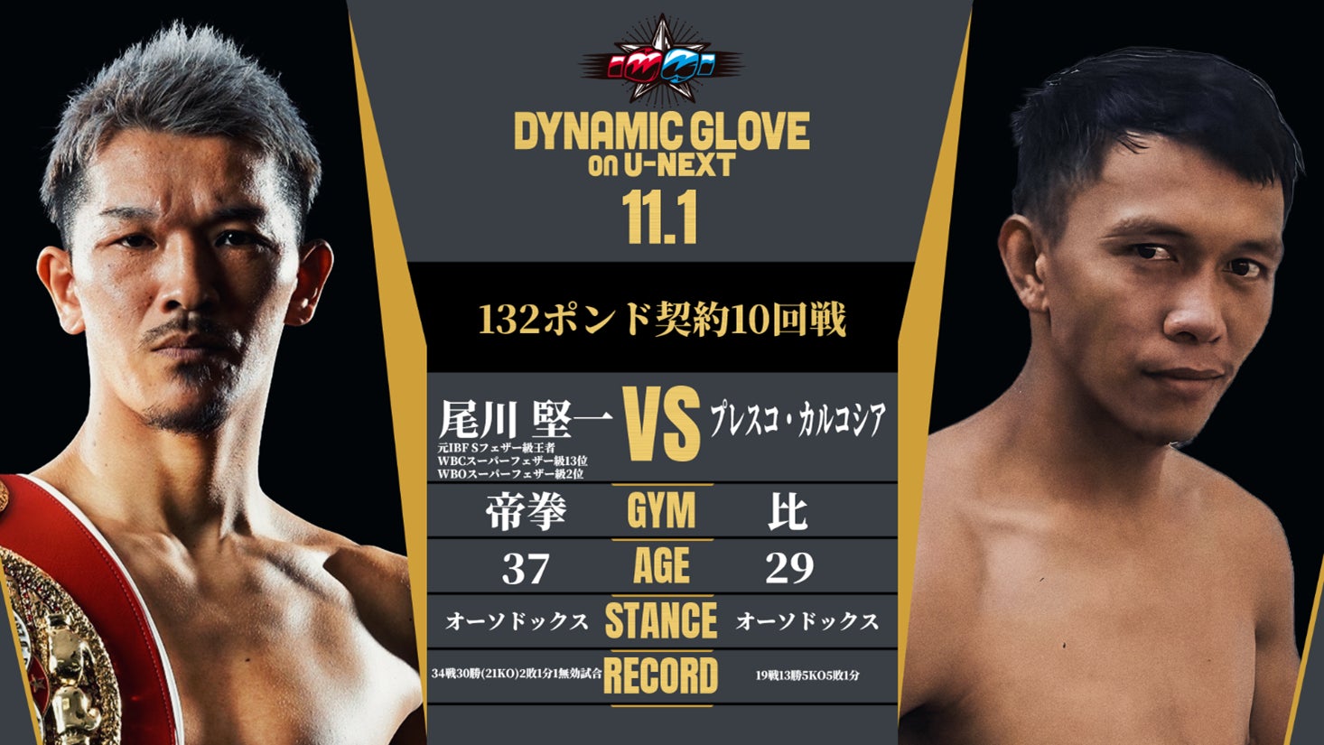 元IBF世界スーパーフェザー級王者の尾川堅一(帝拳)が第37回DYNAMIC GLOVE on U-NEXTのメインイベンターを務める。日本で3度の試合経験を持つフィリピン同級ランカー、プレスコ・カルコシアと拳を交える。現在、WBO2位にランクされる37歳の尾川にとって世界前哨戦となるリング。「自分もあと何戦するか分からない。35戦目にして一戦一戦を大切に思える気持ちになっている」と率直な心境を語る。