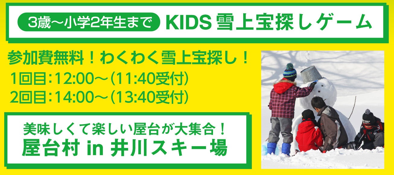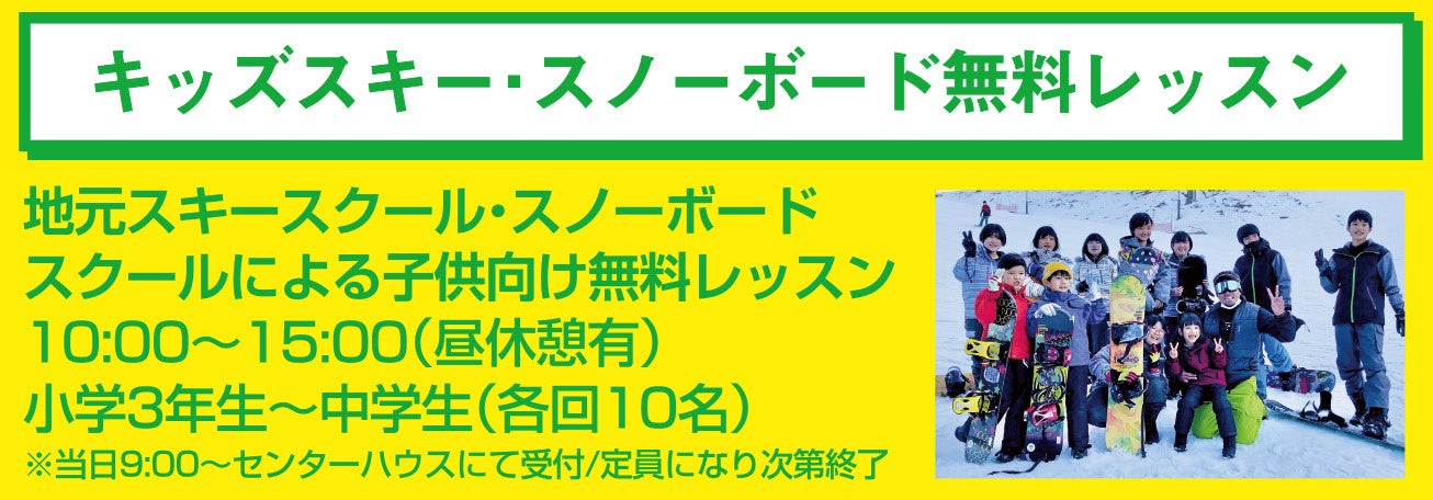 さらに地元スクール・スノーボードスクールによる小学3年生〜中学生に向けた“無料”で参加できるレッスンや、3歳〜小学2年生までのKIDSに向けた「わくわく雪上宝探しゲーム」も開催いたします。