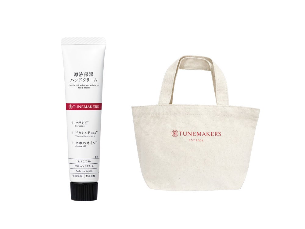 同期間中、税込15,000円以上の購入で「原液保湿ハンドクリーム15g」と「オリジナルランチバッグ(非売品)」をセットでプレゼント。「原液保湿ハンドクリーム15g」は手肌に潤いを与える6種の原液を独自の”うるおい比率”で調合したチューンメーカーズの人気の商品の非売品ミニサイズ。持ち運びに便利なサイズですので、この機会にぜひ手に入れてみてください。