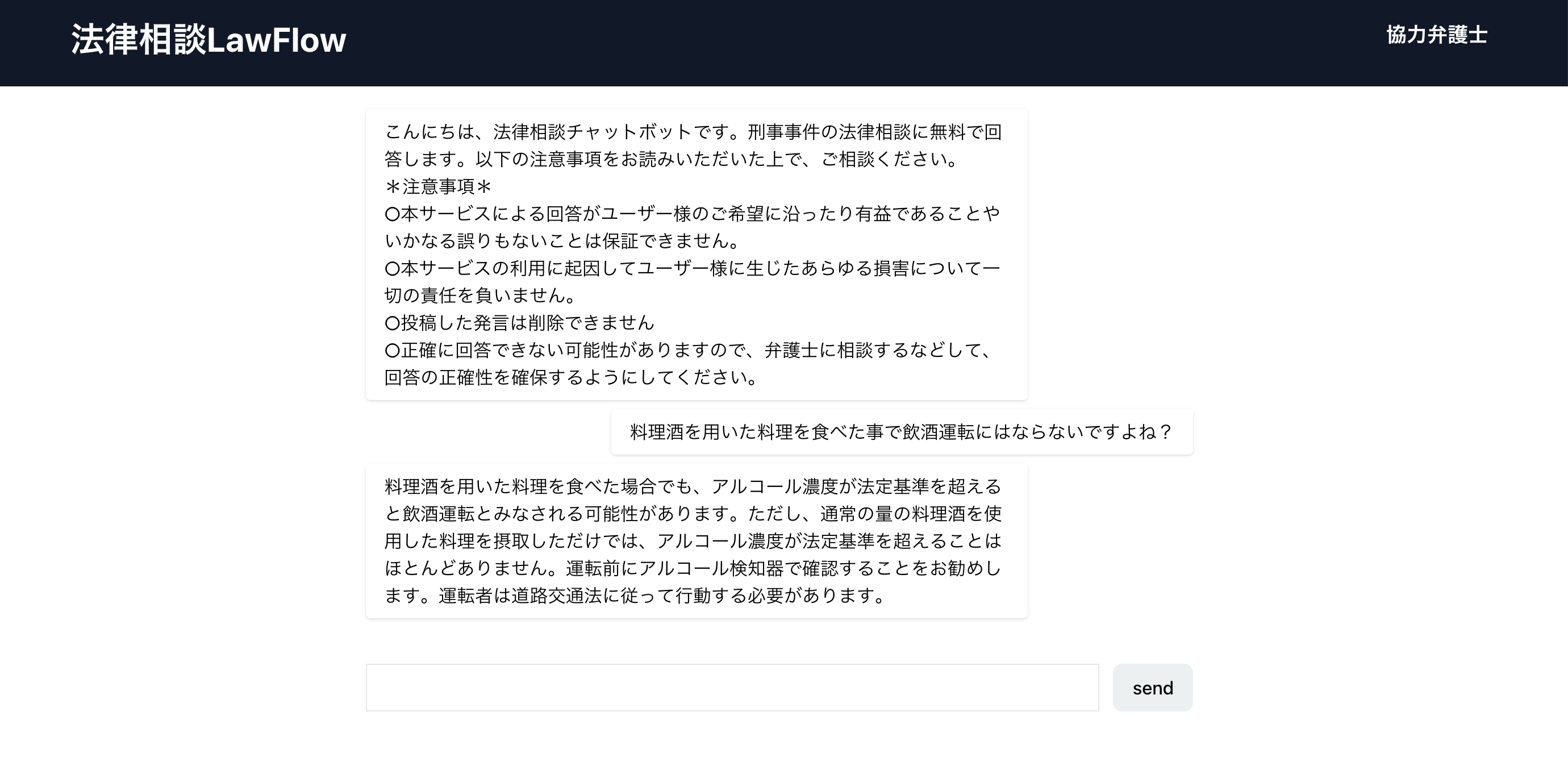 現在は刑事事件に関する相談のみに対応していますが、今後は最新の判例や裁判例も多く学習させることで、精度を向上させて刑事事件以外の相談にも対応拡大していく予定です。