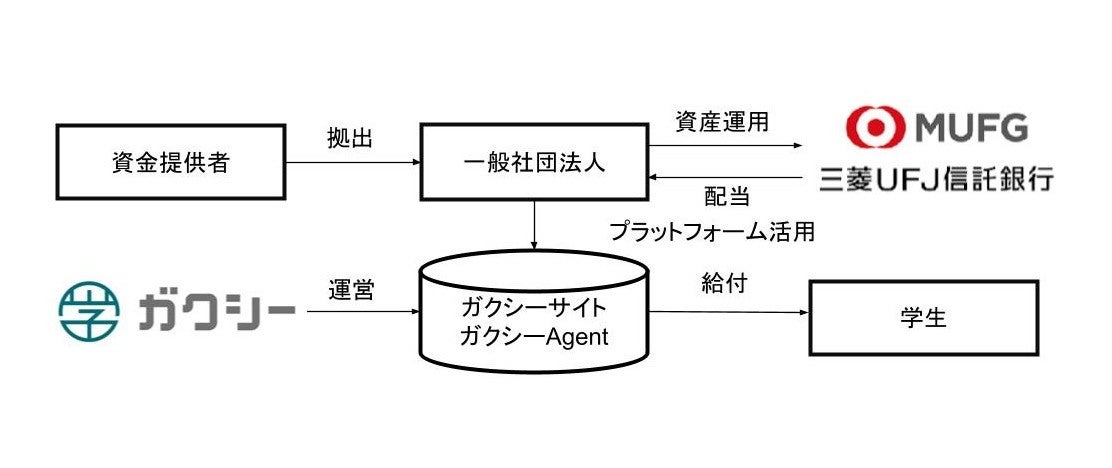 具体的には、資金提供者から寄附・拠出金により一般社団法人に資金を集め、三菱UFJ信託銀行にて運用することで、運用益を原資とした給付型奨学金を創設します。その上で、日本最大級の奨学金情報サイト「ガクシー」を通じて多くの若者に周知し、スマートフォン・パソコンから手軽に応募者を集め、さらに従来手間のかかりやすい奨学金運営も、奨学金運営管理システム「ガクシーAgent」によって選考や支給を効率的に進めることができる想定です。