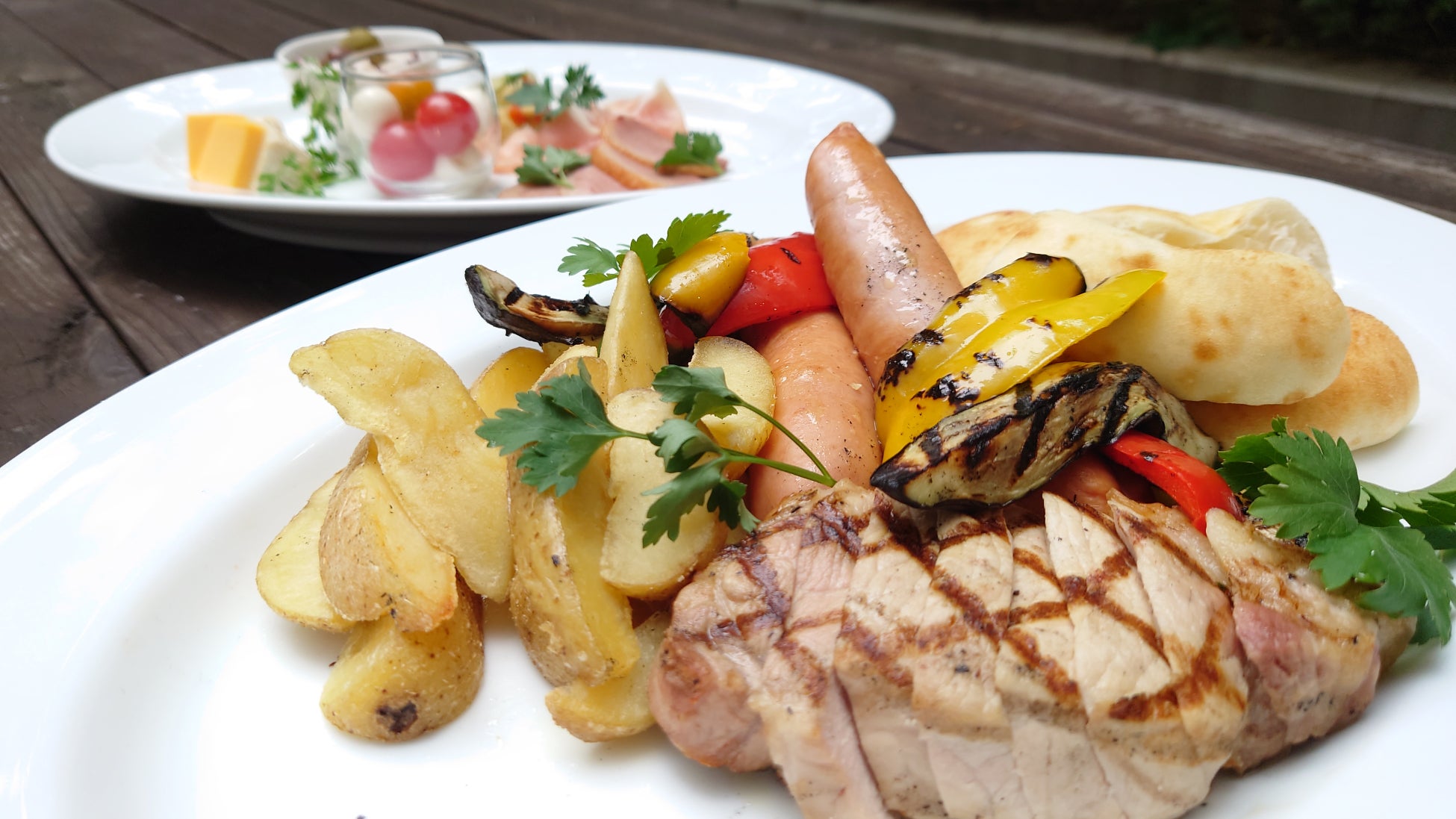 テリーヌ、タコマリネ、ピクルス、チーズ、生ハム、豚肉グリエ、野菜グリエ、あらびきフランク、ポテトフライ、フォカッチャ