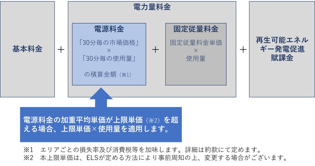「TERASELマーケットあんしんプラン(以下「本プラン」)」は、日本卸電力取引所(JEPX)の市場価格と連動する電力量料金に上限を設けることにより、市場連動型プランのメリットを生かしつつ市場急騰時の電気料金の大幅な上昇リスクにも対応したプランとなっております。