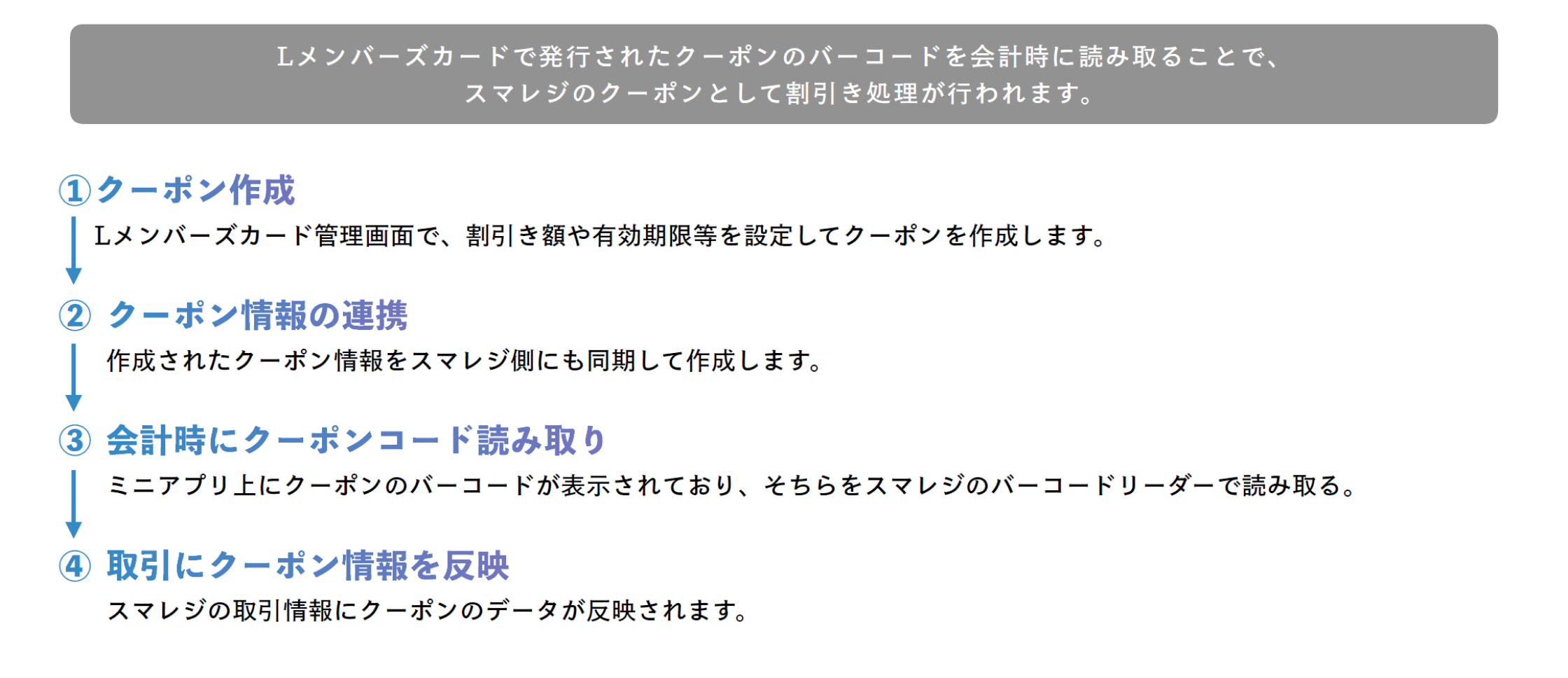 Lメンバーズカードで発行されたクーポンのバーコードを会計時に読み取ることで、スマレジのクーポンとして割引き処理が行われます。スマレジとの連携の流れは以下の通りです。
