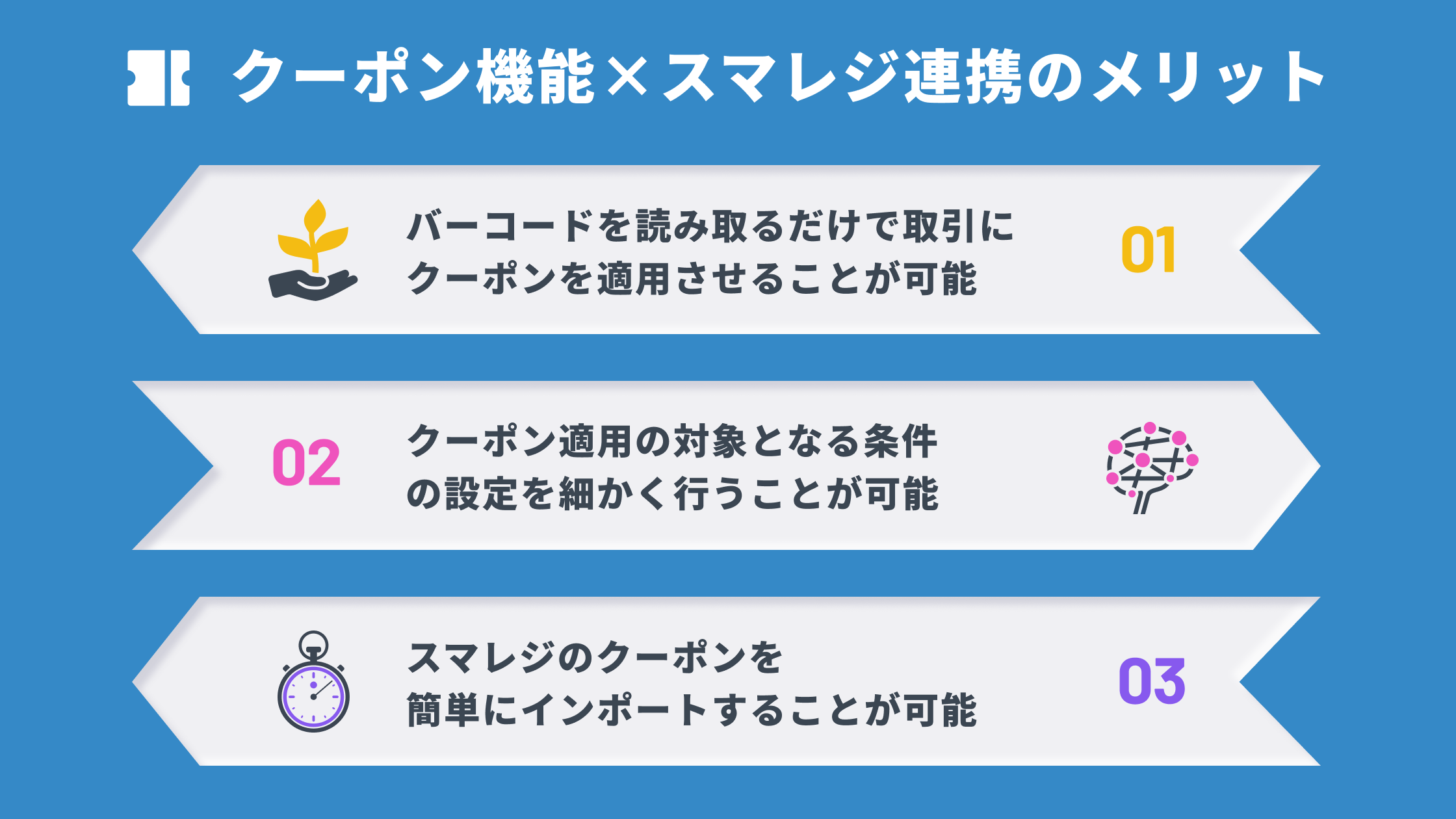 「クーポン機能」をスマレジと連携させることで、以下のようなメリットがございます。
