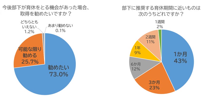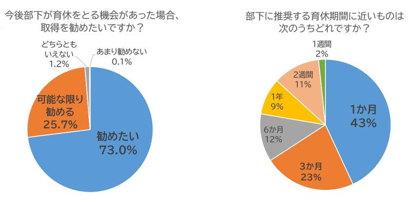 事後アンケートでは、「部下に育休を勧めたい・可能な限り勧めたい」と回答した管理職が98.7%、男性育休の推奨取得期間は「1か月以上」と回答した管理職が87%に