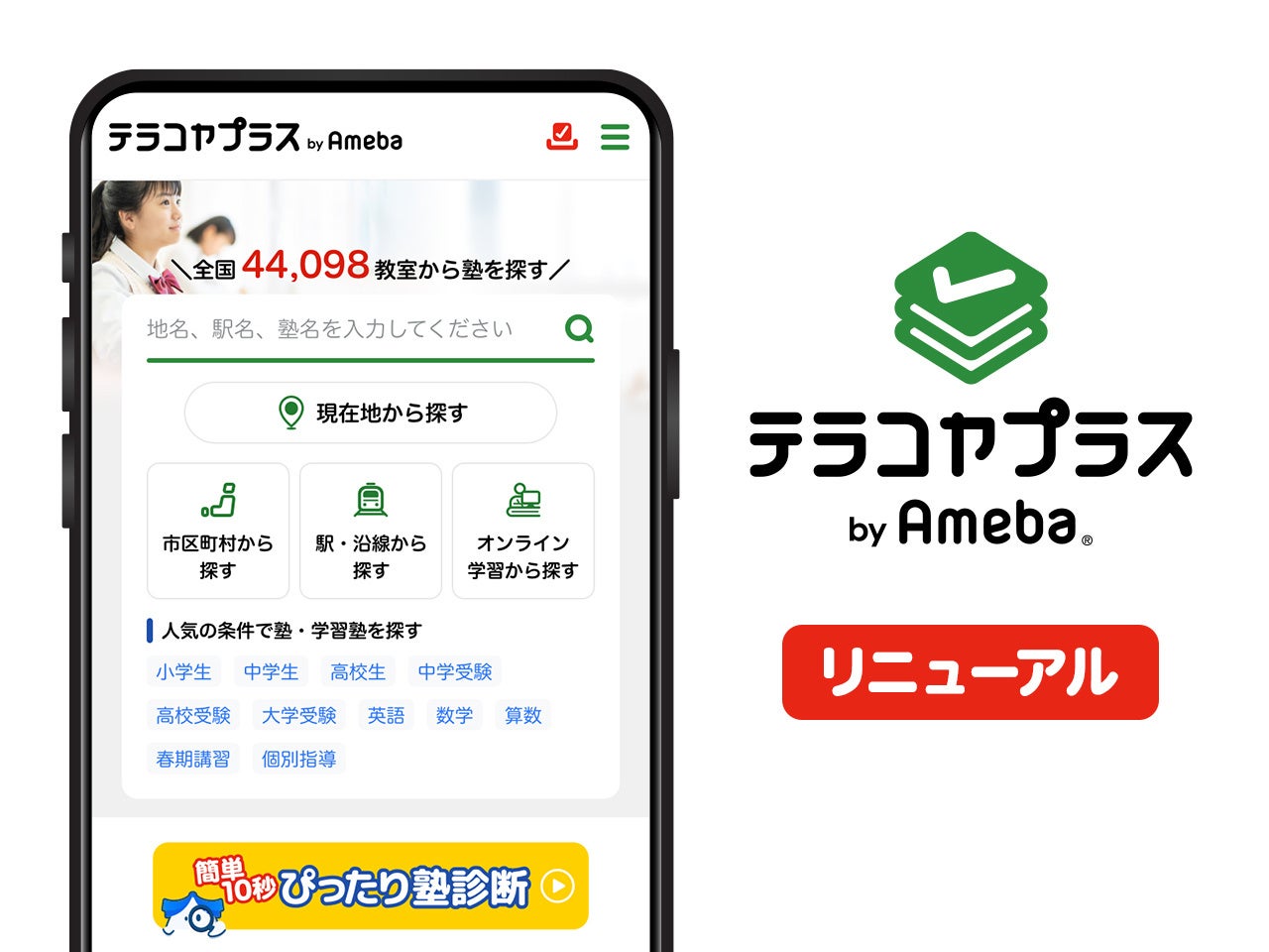 2020年9月16日(水)よりサービス提供を開始いたしました「テラコヤプラス by Ameba」は、全国にある塾・予備校・家庭教師・オンライン塾を掲載し、選び方の決め手となる料金や講師情報、実際に通った方々の口コミなどを詳しく紹介することで、保護者の方やお子さまにとって目的にあった最適な学習環境に出会えるサービスづくりに努めてまいりました。