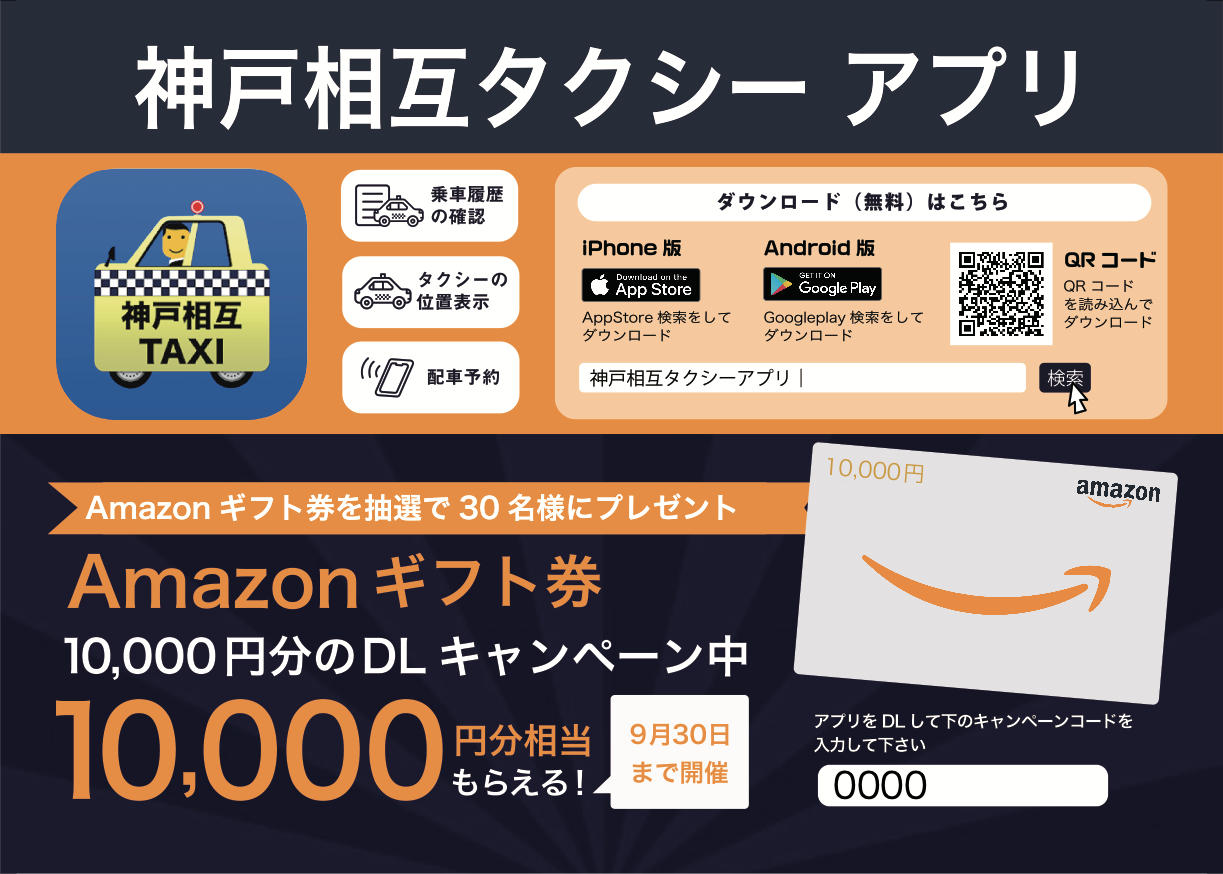 7月16日~9月30日までに、神戸相互タクシー配車アプリをダウンロードされた方の中から抽選で30名様に1万円分のアマゾンギフト券が当たるキャンペーンを実施中。