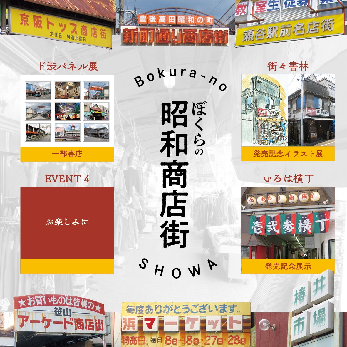本書刊行に際して、全国の書店、商店街35か所で、発売記念パネル展「ぼくらの昭和商店街」を開催。東京都武蔵野市吉祥寺「街々書林」では9月6日(水)〜10日(日)、宮城県仙台市「いろは横丁」では9月15日(金)〜10月15日(日)に開催されます。著者・山本有さんの直筆のイラストと、撮影した商店街の写真を展示します。書籍購入特典として、ハーモニカ横丁、いろは横丁の描き下ろしイラストポストカードを配布! その他全国の「ぼくらの昭和商店街」開催店舗・スポットも『昭和の商店街遺跡、撮り倒した590箇所』WEBサイトで公開中!