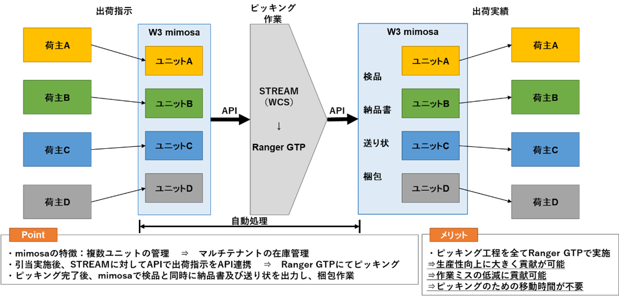 W3 mimosa は従来より充実した標準機能と短期間での立ち上げを強みとしており、また、複数荷主の統合管理機能に優れていることから、今回の標準機能としての対応により、短納期、低コストでの物流センターの自動化実現を更に加速させます。