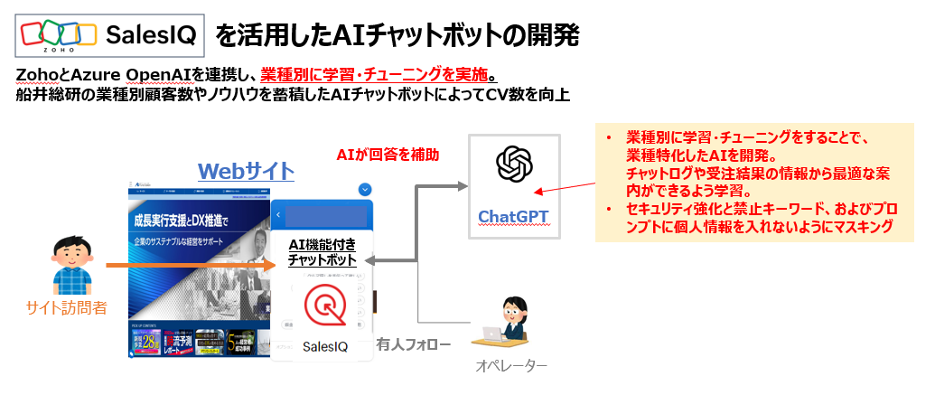 今回の取り組みにおいて、船井総合研究所はAI技術の一つであるChatGPT(チャットジーピーティー)を活用しています。ChatGPTは、自然言語処理と深層学習技術を組み合わせたAIモデルであり、人間との対話において高度な応答を提供することが可能です。このAIチャットサービスと船井総合研究所の反響獲得ノウハウを組み合わせ、Zoho が提供する「Zoho SalesIQ」のチャットボット機能に実装することで、顧客との対話型のコミュニケーションを効果的にサポートし、よりスムーズに反響獲得に結び付けることが可能になります。