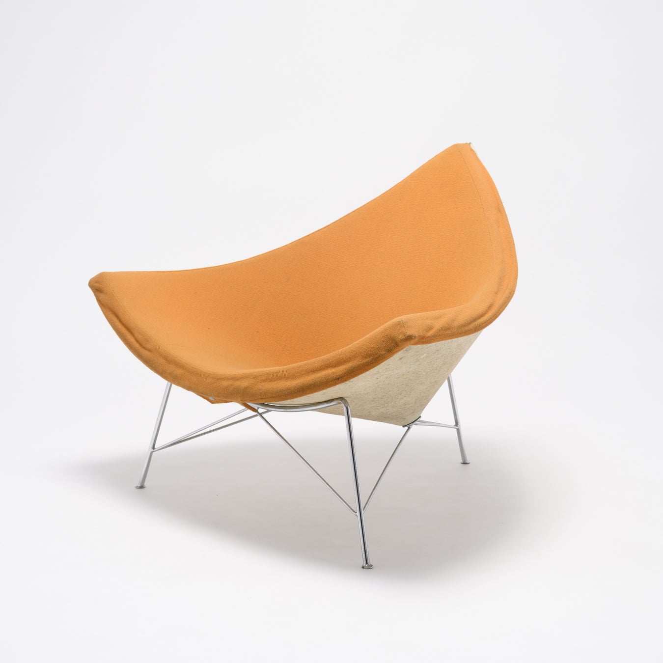 モダンデザインの傑作とも言われる“ココナッツチェア”。特徴的な椅子の形状はココナッツの塊からヒントを得たようで、ココナッツを8当分したうちの1つのかけらのようなデザインになっています。背もたれの部分だけ両サイドよりも少し長くなっており、背をしっかりと支えることで快適性を生み出しています。