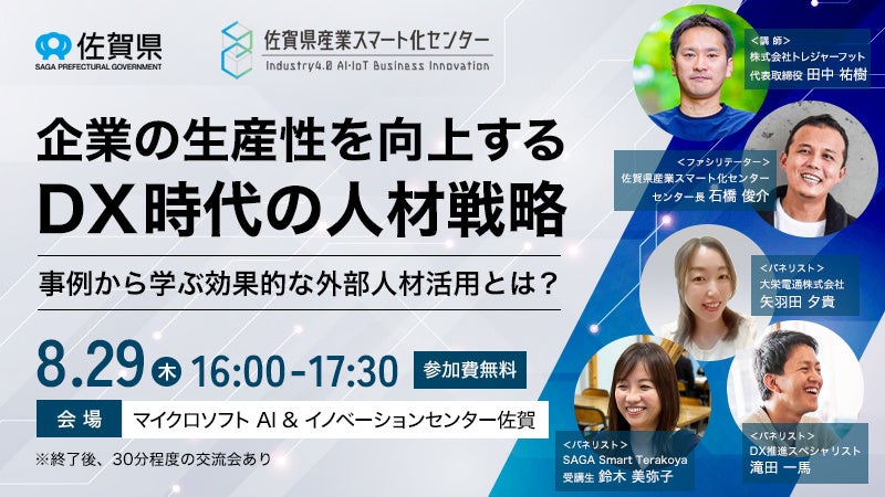 この度、株式会社トレジャーフット(本社:神奈川県鎌倉市、 代表取締役 田中 祐樹)は、佐賀県「令和6年度 IT人材起業・複業活躍推進事業」を受託し、8月29日(木曜日)に「企業の生産性を向上するDX時代の人材戦略」をテーマに外部人材活用セミナーを開催いたします。